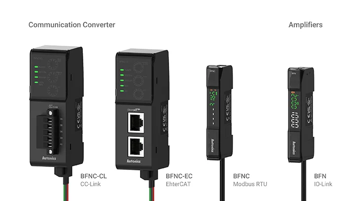Các model hiển thị hiệu suất cao hỗ trợ truyền thông IO-Link và cho phép giám sát trạng thái cảm biến theo thời gian thực. Người dùng có thể kết nối với các mạng công nghiệp chính như EtherCAT và CC-Link bằng cách sử dụng bộ chuyển đổi truyền thông chuyên dụng với bộ khuếch đại sợi quang (BFNC). BFN series tương thích linh hoạt với nhiều môi trường mạng mở khác nhau.
